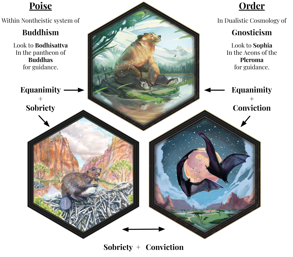 ORDER - the result of a conversation between Conviction and Equanimity as understood and modeled by Sophia in Gnosticism.FORTITUDE - the result of a conversation between Courage and Conviction as understood and modeled by Ogun in the Yoruba Religion.