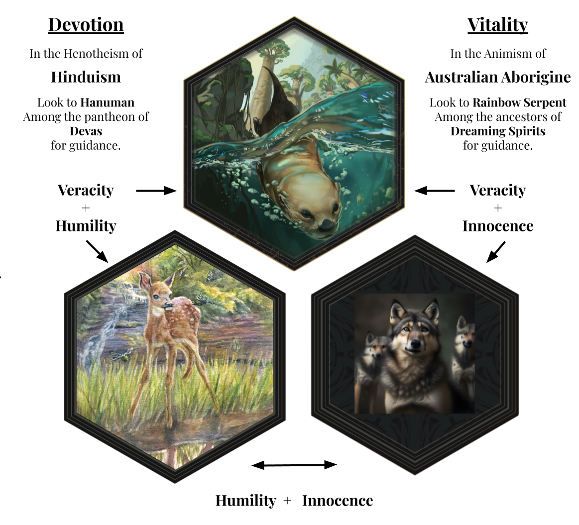They also branch into human experience; accessible to us as Virtues, featured to us in the teachings of perennial traditions, manifested through us in the form of Sacred Technologies.Each of the 9 Virtues exist as a composite “conversation” between two Divinities.